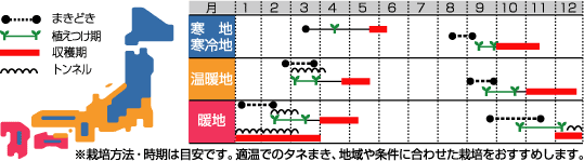 温暖地・暖地の冬春どり作型に適します。土壌はとくに選びませんが、酸性土壌では生育がわるくなるので注意します。