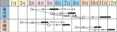 ・晩抽性品種ではあるが、高温期は抽苔の恐れがあるため注意する。