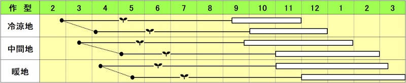 5~6月に雨除けハウス等に仮植し、9月上旬に本圃に定植する。