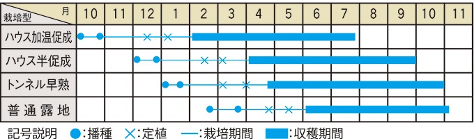 発芽温度は20~30℃、生育温度は25℃前後なので育苗期間中は保温に努める。日中は温度が上がりすぎないように換気する。