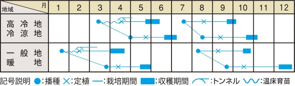 元肥は全面施肥・1㎡あたり苦土石灰100g・堆肥3kg・化成肥料100gとする。畝幅60cmの畝に、本葉5~6枚の苗を株間20~30cmで定植する。