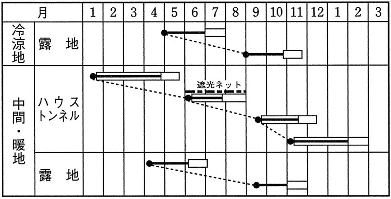 ●関西系の青ミツバ栽培に適し、作りやすく、施設を利用すると周年栽培ができる。