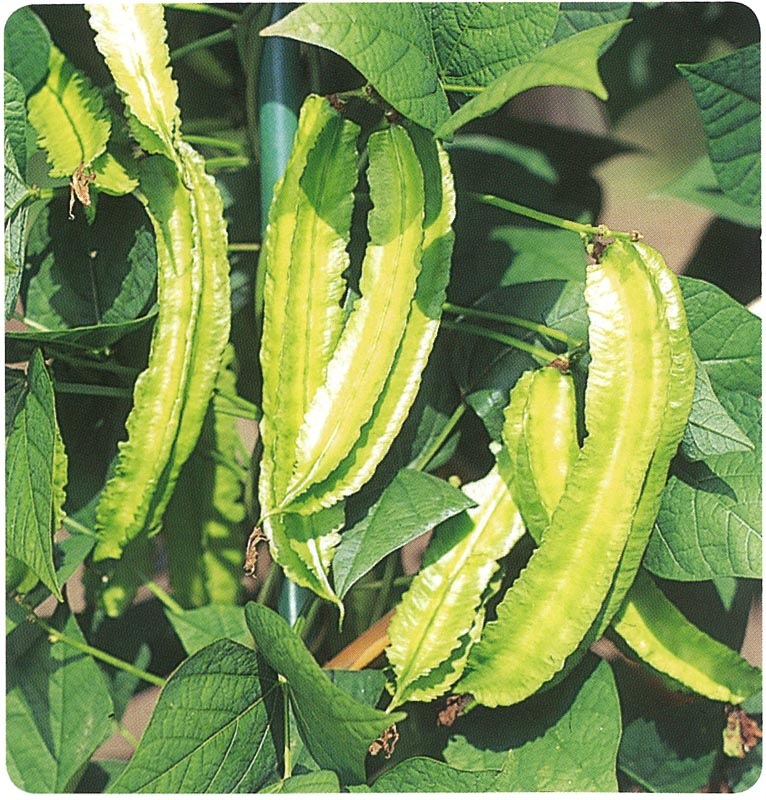 8月上旬に淡青色のスイートピーに似た花を咲かせ、9月を中心に若莢を収穫します。莢の長さは約15cm、断面は正方形です。高温・短日性で15℃以上の気温があればよく育ちます。