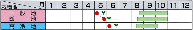 高温性作物で霜に弱いので、地温が十分上昇してから播種します。遅まきすると長日で着花が悪くなるので、一般には保温して育苗します。20℃以上の温度を確保し、3号(9cm)ポリ鉢に3~4粒播種します。播種から発芽するまでは乾かさないようにします。発芽後1~2本立ちにし、本葉が3~4枚になったころに植えつけます。畝間100cm、株間50cmを標準とします。