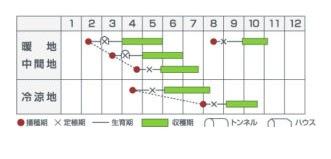 播種:4月中旬~7月下旬 定植:5月中旬~8月中旬 収穫:6月上旬~10月中下旬