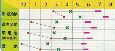 ・寒・高冷地(標高1000m以上)3月~4月蒔き-7月~8月収穫。