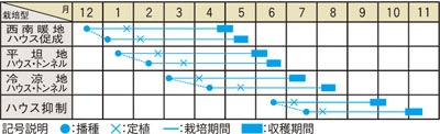 株間50~60㎝。施肥設計はN:P:K=10~12㎏:15㎏~20㎏:10~15 ㎏を標準。