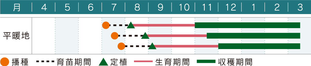 ・一般地7月中旬~8月中旬播種、11月上旬~3月中旬まで、