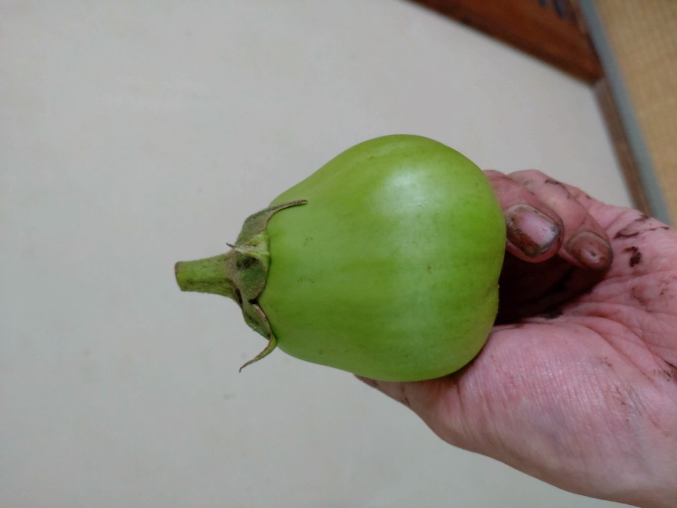 果皮が緑色で、巾着型の大きなナス。