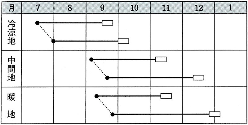 耐寒性はあまり強くないので、播種時期の設定に留意する。また、耐暑性はある程度兼ね備えるが、無理な早まきは避ける。