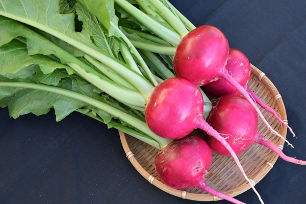 ・根部の肌は、全面美しい鮮紅色です。形は豊扁円球になります。