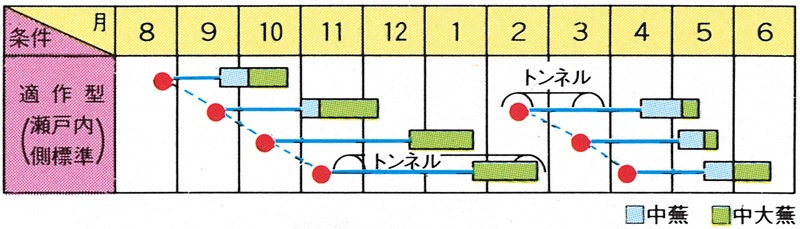 ・平暖地での9月上旬~下旬蒔き、10月下旬~12月どり、冷涼地での8月中旬~9月上旬蒔き、10月から12月どりが最適です。晩夏から一般秋蒔き栽培では、播種後約45日で根径8cmくらいの中蕪に、約60日で12~13cmくらいの大蕪に成育し、一斉収穫が可能です。